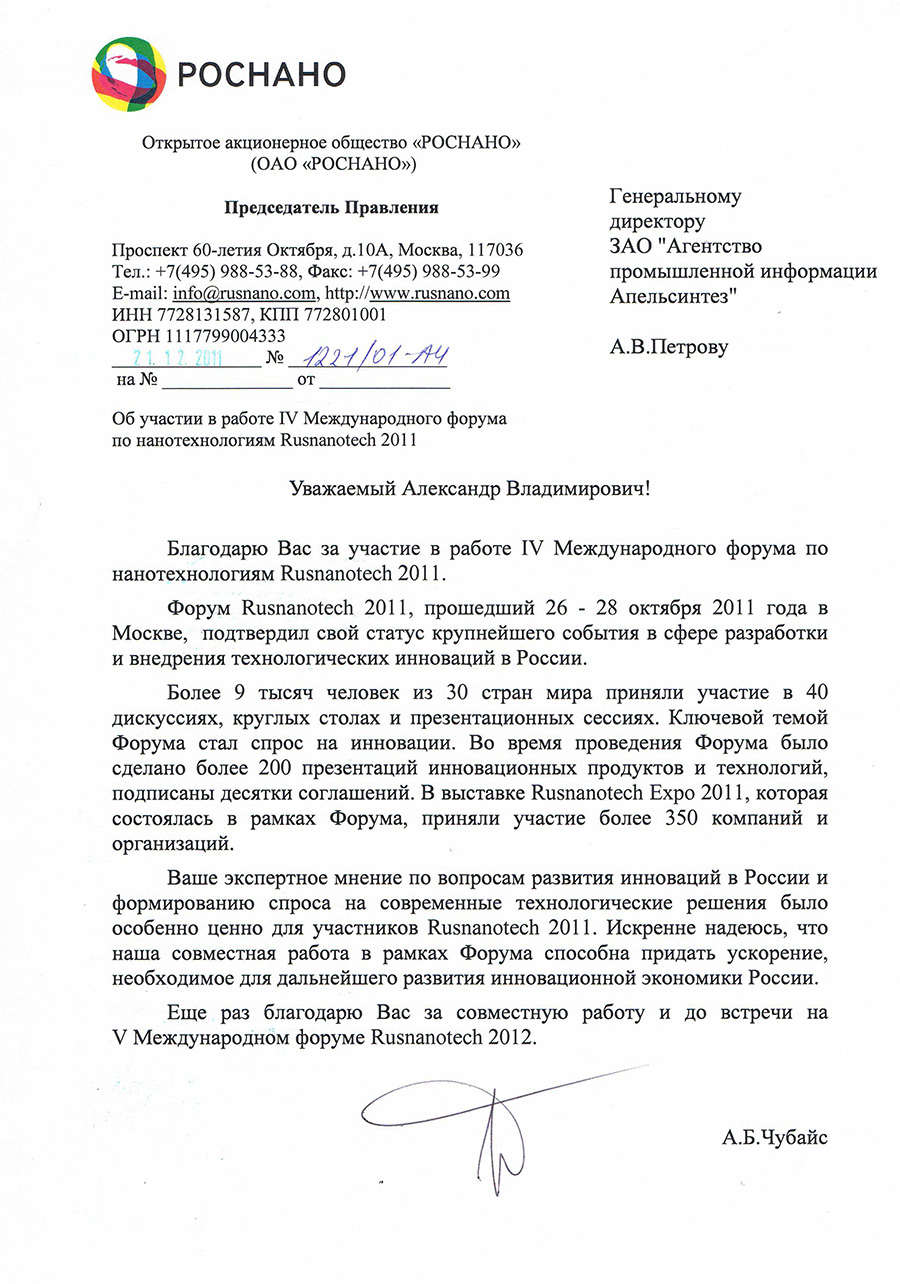 Еще раз благодарю Вас за совместную работу и до встречи на V Международном форуме Rusnanotech 2012.