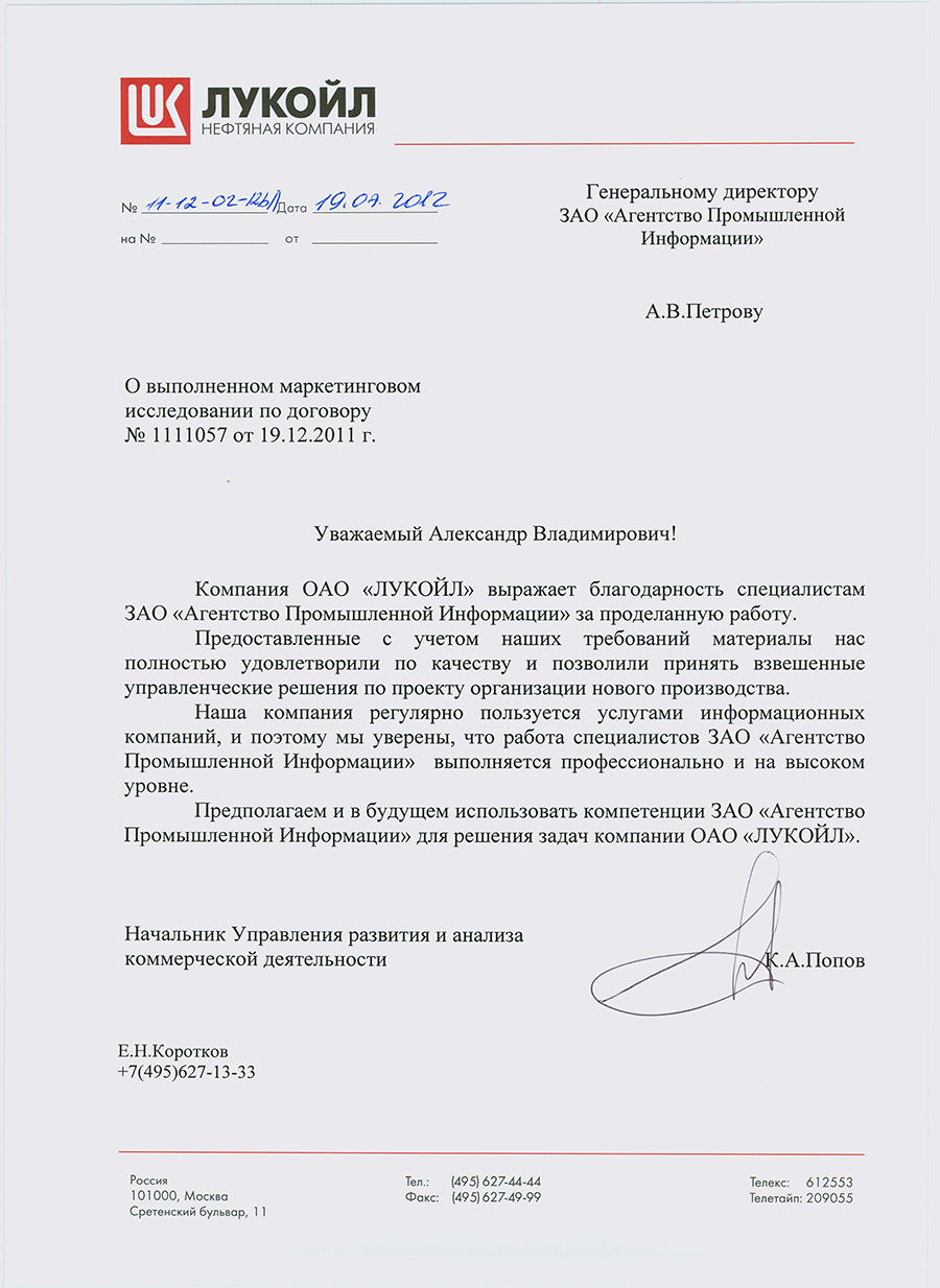 Компания ОАО «ЛУКОЙЛ» выражает благодарность специалистам ЗАО «Агентство Промышленной Информации» за проделанную работу.