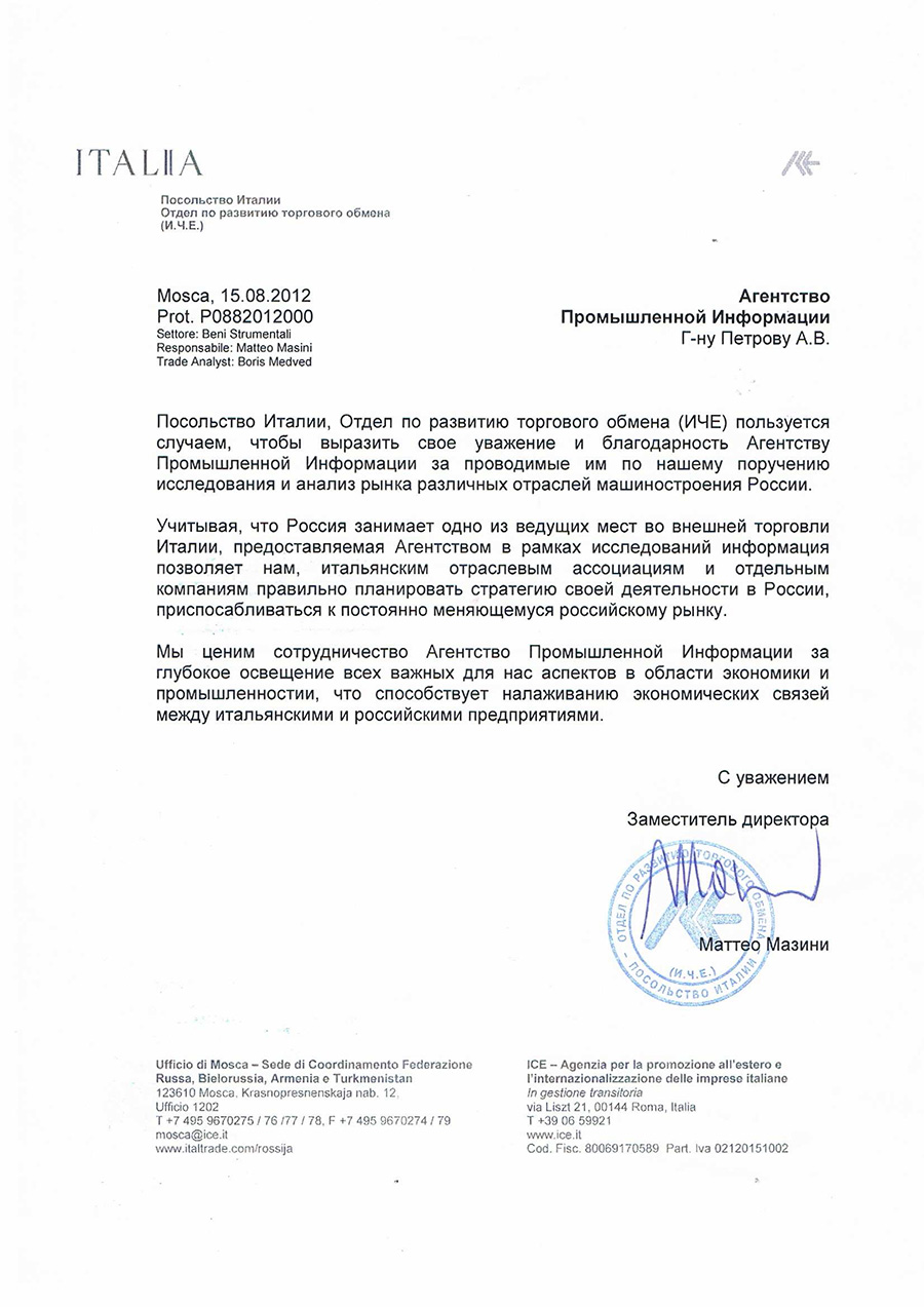 Посольство Италии, Отдел по развитию торгового обмена (ИЧЕ) пользуется случаем, чтобы выразить свое уважение и благодарность Агентству Промышленной Информации за проводимые им по нашему поручению исследования и анализ рынка различных отраслей машиностроения России.