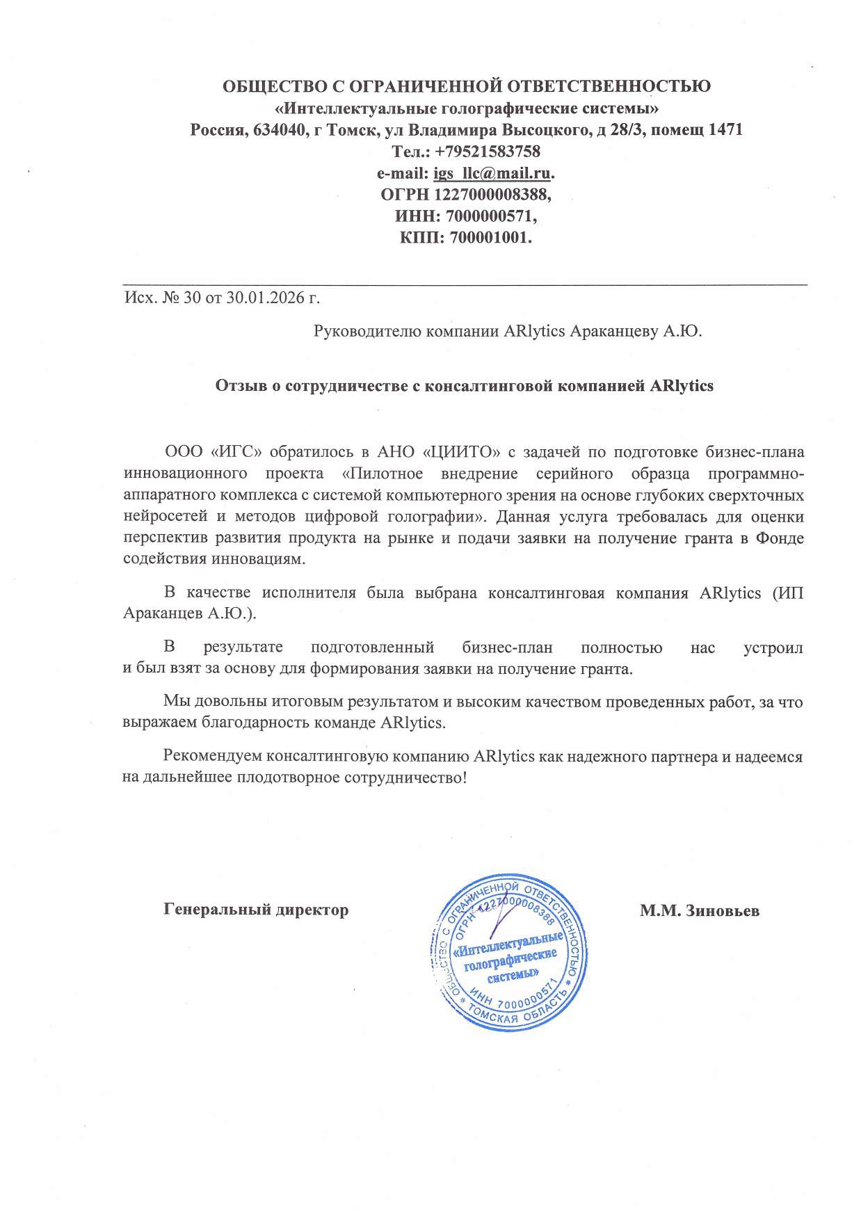 ООО «ИГС» обратилось в АНО «ЦИИТО» с задачей по подготовке бизнес-плана инновационного проекта «Пилотное внедрение серийного образца программно-аппаратного комплекса с системой компьютерного зрения на основе глубоких сверхточных нейросетей и методов цифровой голографии». Данная услуга требовалась для оценки перспектив развития продукта на рынке и подачи заявки на получение гранта в Фонде содействия инновациям.