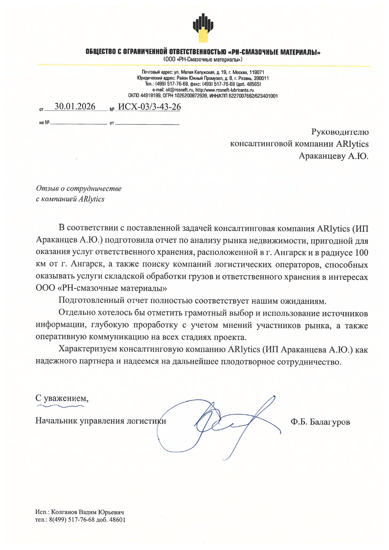 В соответствии с поставленной нами задачей консалтинговая компания ARlytics (ИП Араканцев А.Ю.) подготовила отчет по анализу рынка недвижимости, пригодной для оказания услуг ответственного хранения, расположенной в г. Ангарск и в радиусе 100 км от г. Ангарск, а также поиску компаний логистических операторов, способных оказывать услуги складской обработки грузов и ответственного хранения в интересах ООО «РН-смазочные материалы»