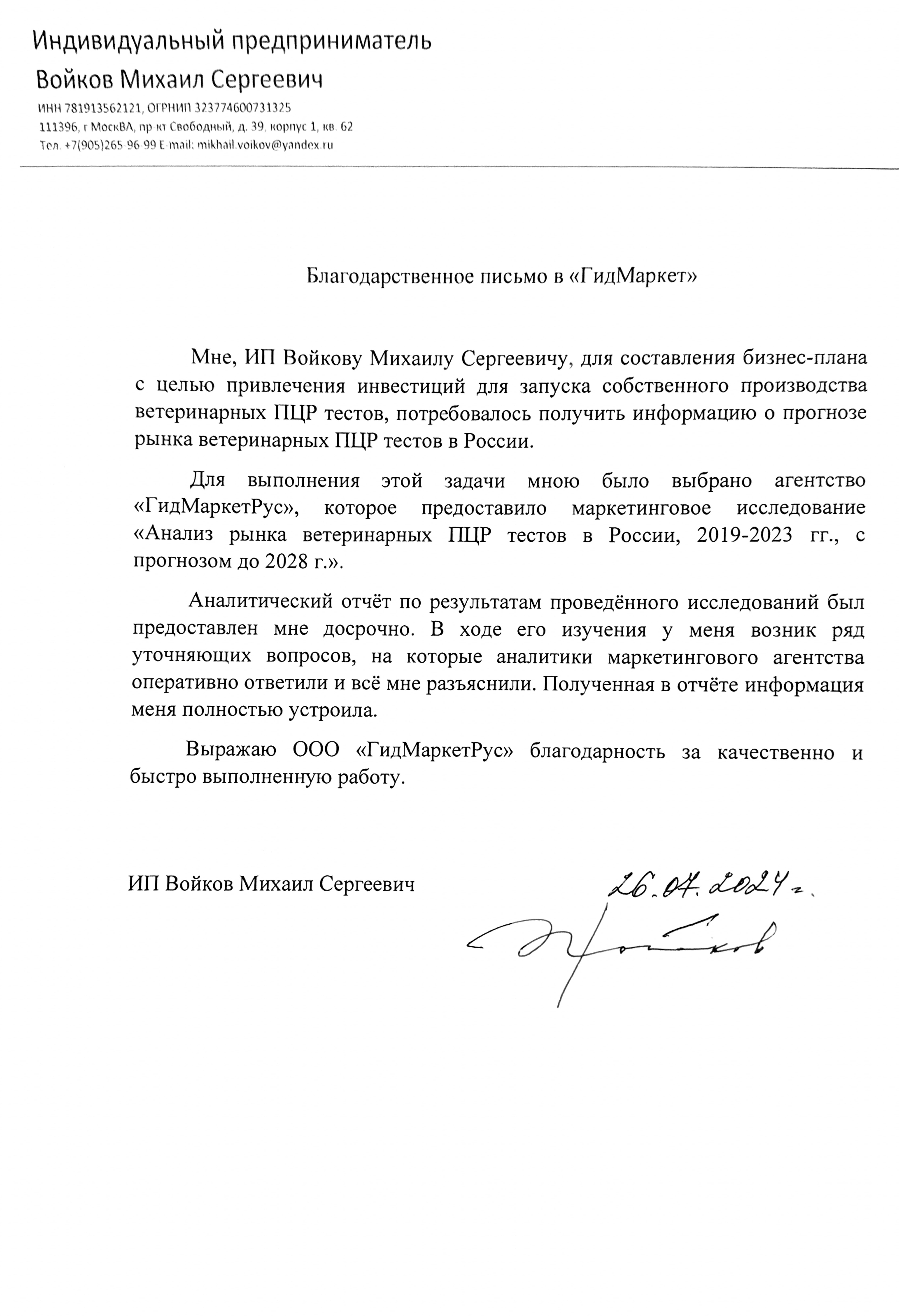 Мне, ИП Войкову Михаилу Сергеевичу, для составления бизнес-плана с целью привлечения инвестиций для запуска собственного производства ветеринарных ПЦР тестов, потребовалось получить информацию о прогнозе рынка ветеринарных ПЦР тестов в России.