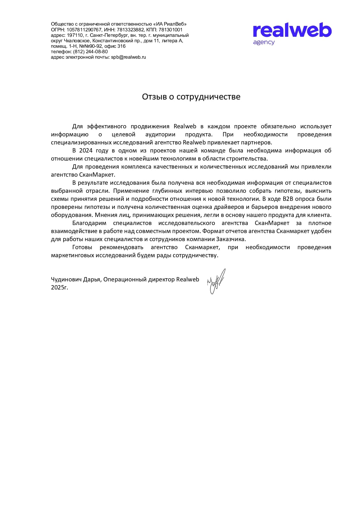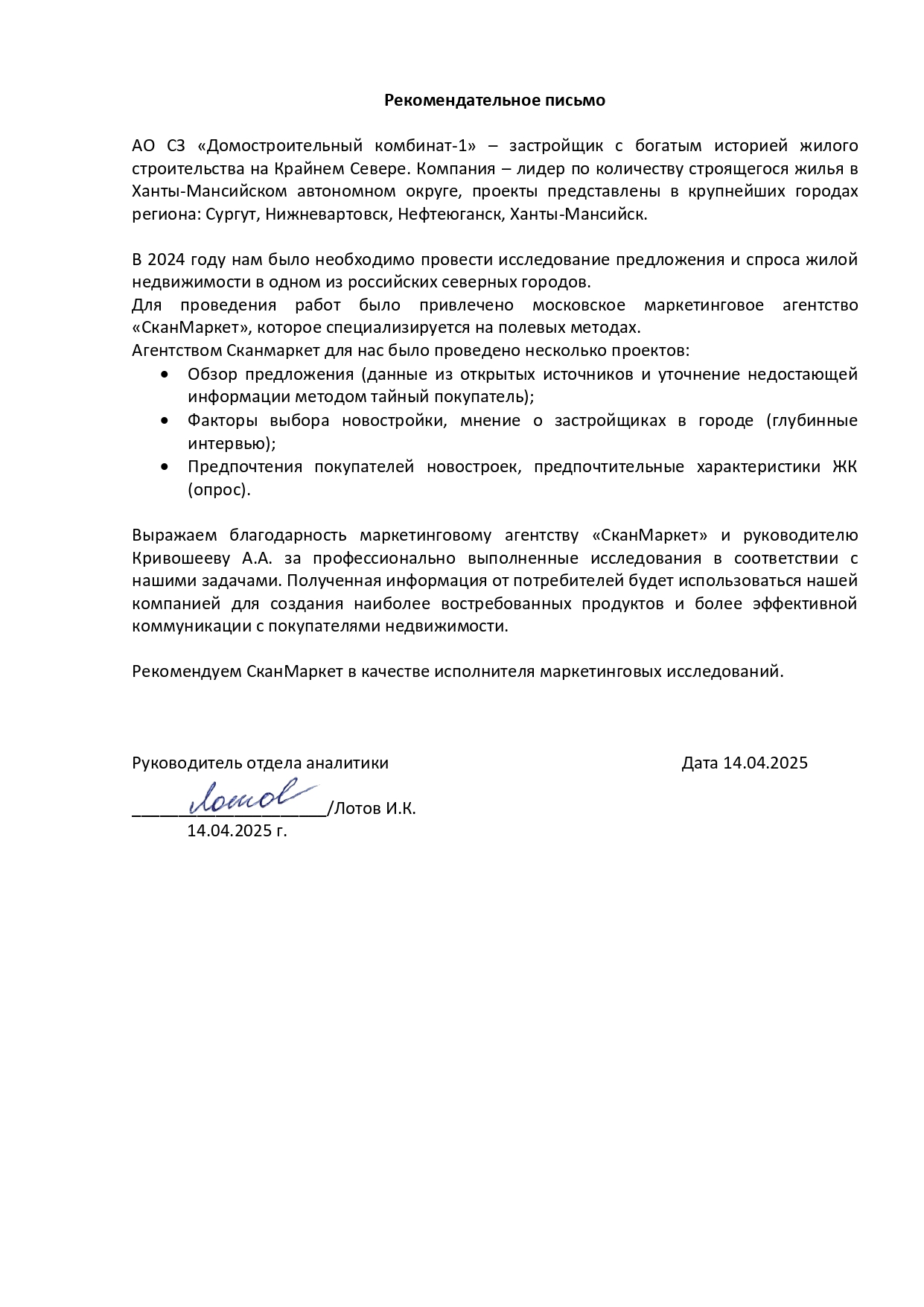 Выражаем благодарность за профессиональную работу, рекомендуем агентство СканМаркет в качестве исполнителя в области маркетинговых исследований.