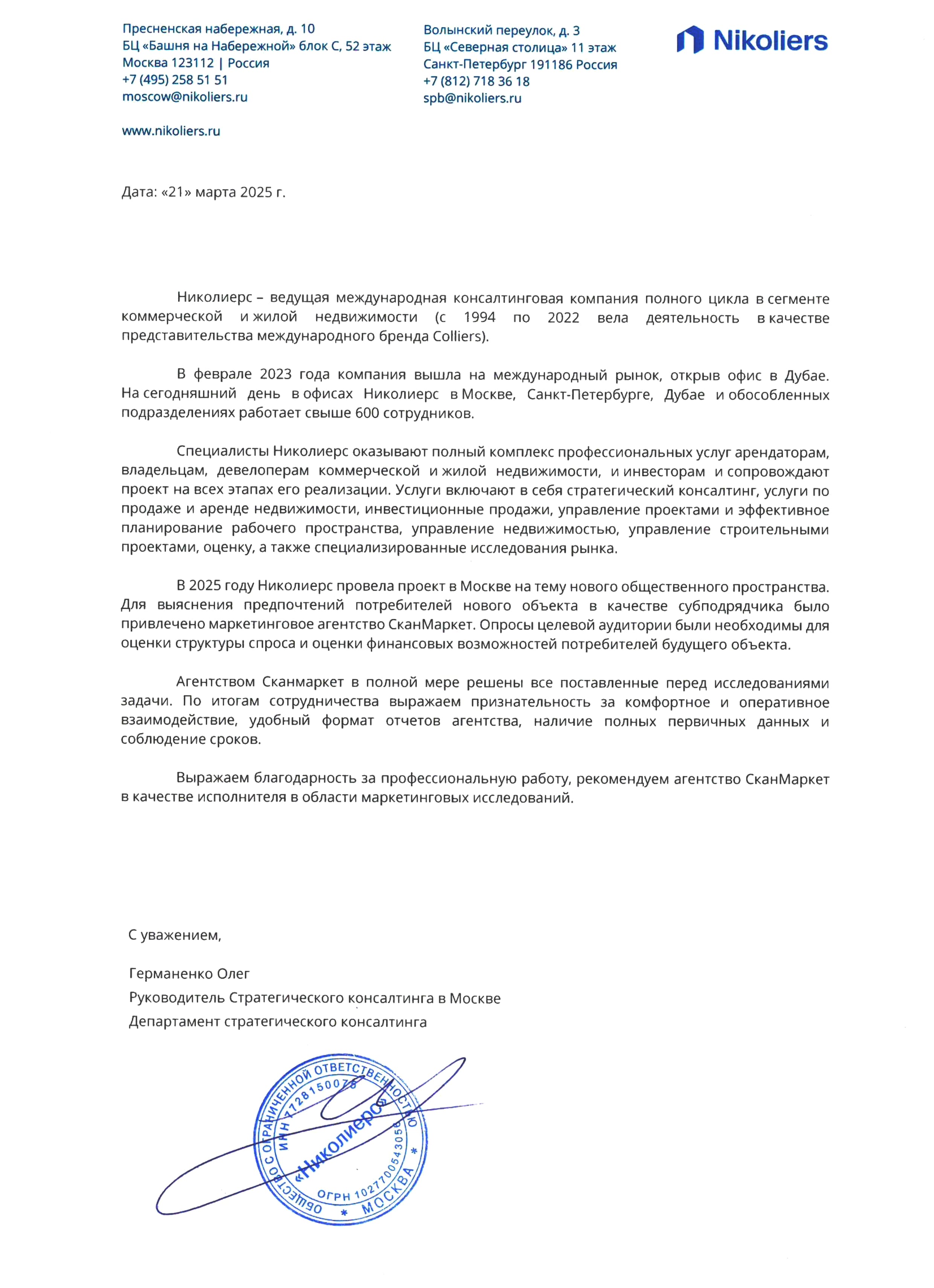 В 2025 году Николиерс провела проект в Москве на тему нового общественного пространства. Для выяснения предпочтений потребителей нового объекта в качестве субподрядчика было привлечено маркетинговое агентство СканМаркет. Опросы целевой аудитории были необходимы для оценки структуры спроса и оценки финансовых возможностей потребителей будущего объекта.