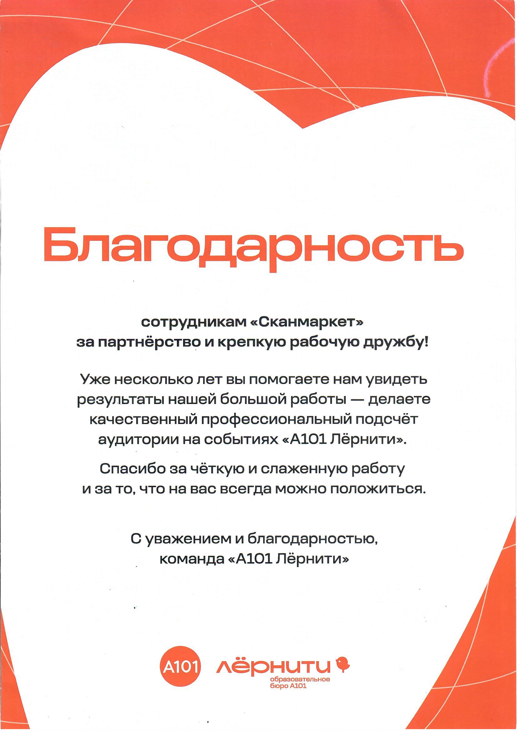 Благодарность сотрудникам «Сканмаркет» за партнёрство и крепкую рабочую дружбу!
