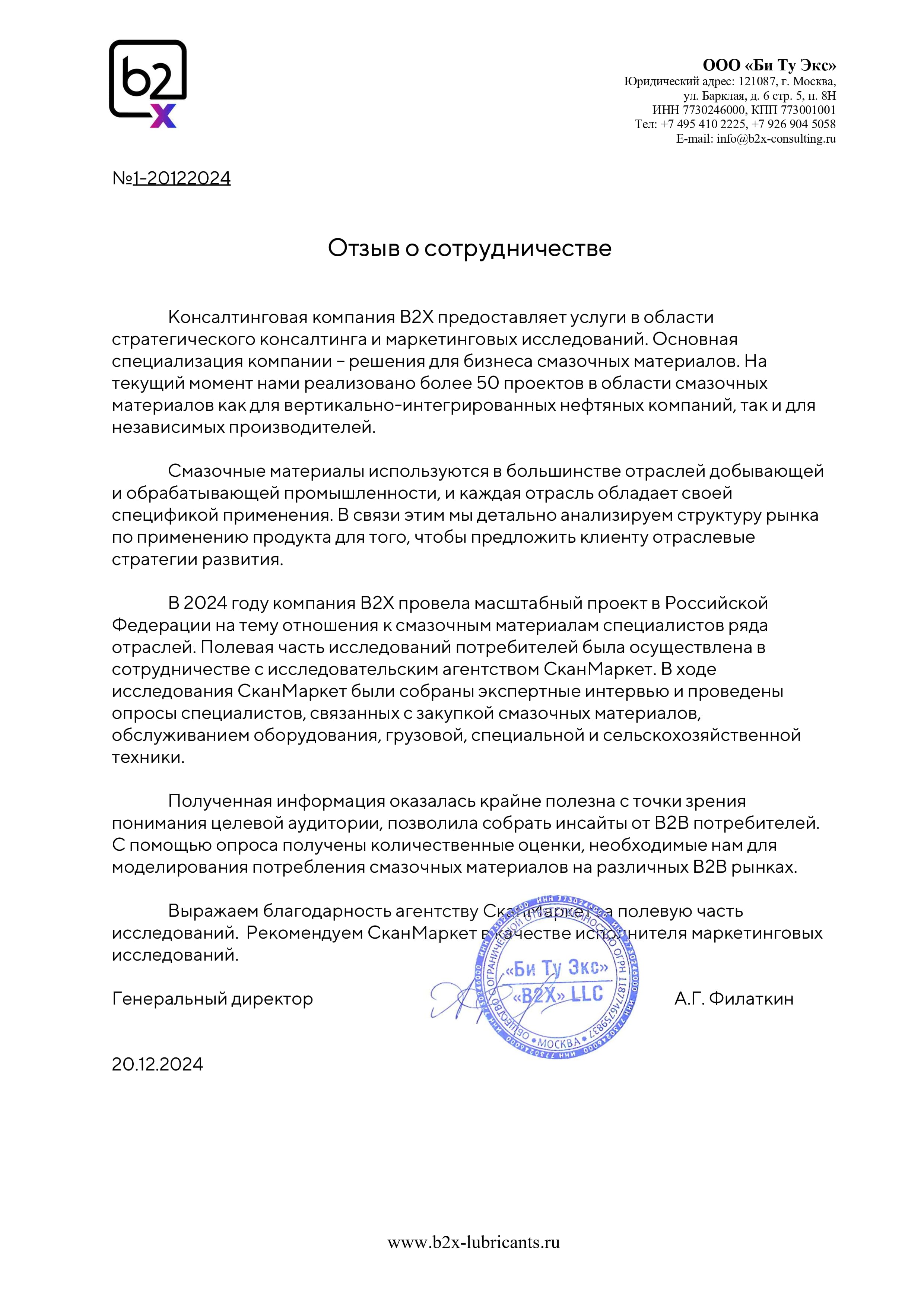 В 2024 году компания В2Х провела масштабный проект в Российской Федерации на тему отношения к смазочным материалам специалистов ряда отраслей. Полевая часть исследований потребителей была осуществлена в сотрудничестве с исследовательским агентством СканМаркет. В ходе исследования СканМаркет были собраны экспертные интервью и проведены опросы специалистов, связанных с закупкой смазочных материалов, обслуживанием оборудования, грузовой, специальной и сельскохозяйственной техники.